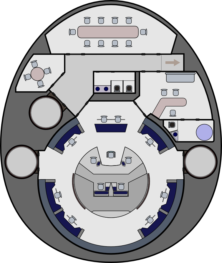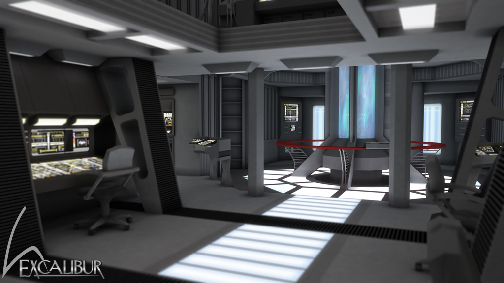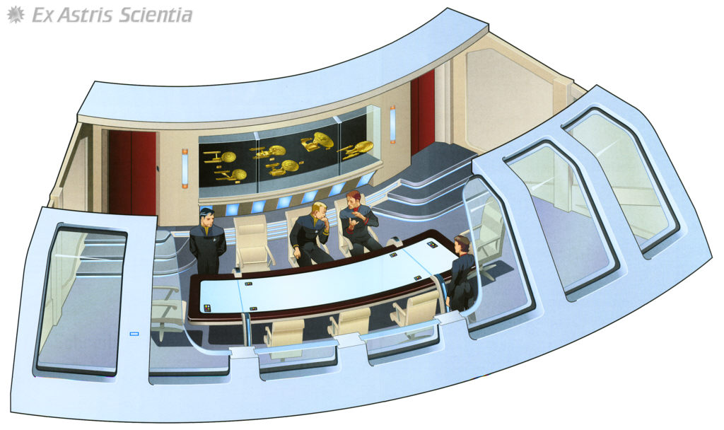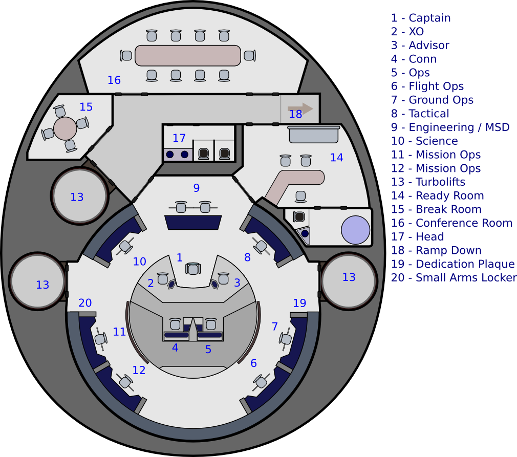 The captain sits at the center of the bridge. From here he can easily see all the stations on the bridge. Beside him are seats for the executive officer and a mission advisor, who have small consoles and sit at a slightly lower level. Ahead of them are the Conn and Ops stations side by side, which are lower still in order to allow the captain a clear view of the viewscreen. The remaining stations are arrayed around the room. Starting at the port side of the screen is Mission Ops I and II, which are frequently used to monitor flight and groundside activities. At the centerline is a turbolift, followed by Tactical/Security. At the rear of the bridge is a free-standing engineering station, with the MSD behind it. To either side of the MSD are doors to the Ready Room and a corridor to the rest of the deck, including the briefing room, a small break room, a head, and a ramp down to Deck 4. Continuing on is Science, another turbolift, then Mission Ops III and IV, which are configurable to multiple purposes such as intelligence or additional science stations. Finally, dead ahead is a holographic viewscreen. All of these stations have chairs, and the Mission Ops stations can have extras added as necessary. Overall the bridge has a slightly 'classic' feel to it. This design philosophy would latter be echoed on the bridge design of the Prometheus class. - Related Areas: Briefing Room, Ready Room