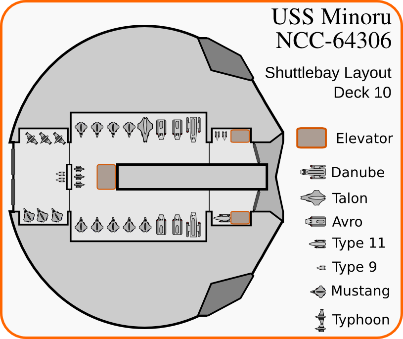 - The shuttlebay is on Deck 10 (high bay space on 9), with additional maintenance and storage facilities on Deck 11. Minoru's small craft are found here, including all of the fighters, runabouts, and large transports. For the sake of safety and convenience, it is broken into four areas. Bays 1 and 2 are at the aft end, and are primarily used for landing and shuttle operations. Bay 3 is the launch area at the front of the ship, and between is the Hangar. All of these areas can be isolated by pressure doors and forcefields in an emergency. The bay has a through-deck design that allows for simultaneous launches and recoveries. There are three elevators that allow access to Deck 11; however, only shuttles, hoppers, and workbees can actually fit in the lower level.
